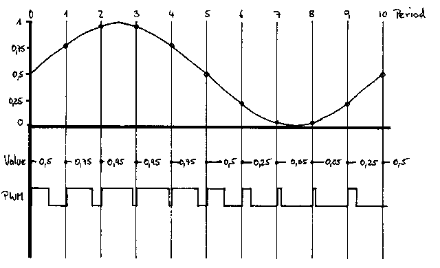 in the duty cycle of the PWM signal. In other words: In each period, the
