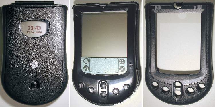 Palm finally found a very nice solution for the protective cover. Coming with a double hinge, the lid travels 180 degrees over the case all the way to the back. That's a great construction for every-day use and very convenient. The scroll and application keys are in the usual place and completely covered by the lid. The m100 cover protects the keys quite well, unless you press the lid really hard. The power key moved to the top center of the unit and is also hidden very well when the cover is closed. Palm implemented a nifty little idea: The protective lid has a hole above the scroll up key and a transparent window above the upper third of the LCD (see left photo above). When the m100 is switched off, and only then, the scroll up key switches it on for about 2 seconds to show time and date through that window. Following the trend on the mobile phone market, the m100 has a snap-on faceplate. Palm offers quite a variety of colors themselves and the third-party market will surely also offer more chances to customize the m100. Probably to compete with Handspring's entry level price, there is no cradle supplied with the m100. Instead Palm bundles a hotsync cable which has a hotsync key on the Palm plug side. On the road, that solution is anyway more convenient than a cradle. However, if you plan to use and sync the m100 at your desk alot, it's better to add the $29.95 for the optional cradle right away. . |