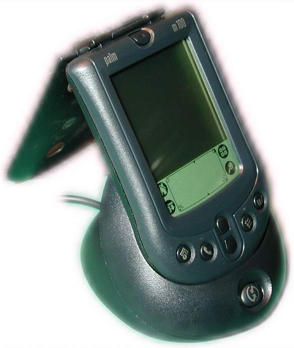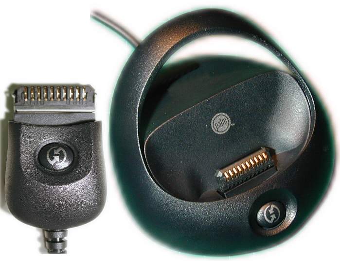 As usual, the cradle doesn't contain any real active parts. Like always so far, it's a pure mechanical connection between the serial port of the Palm and the one of the PC. Gratifying, Palm added a solid piece of metal on the cradle floor, so it stands solid as a rock. Not quite unimportant for people like me, who sometimes tend to 'tear' their Palm out of the cradle, passing by the desk in a hurry ... :) The pin-out didn't change from the Palm III series (except the IIIc which has the charge power pin), but unfortunately Palm modified the physical dimensions of the plug slightly. Beeing more specific, the new m100 hotsync plug would fit in a Palm III, but it would be a bit too long which wouldn't matter much. But an old Palm III plug is a bit too short to reach the contacts in the m100. Because of the complete new case shape, the old accessories won't fit on the m100 neither. Again, electrically they would work. . |