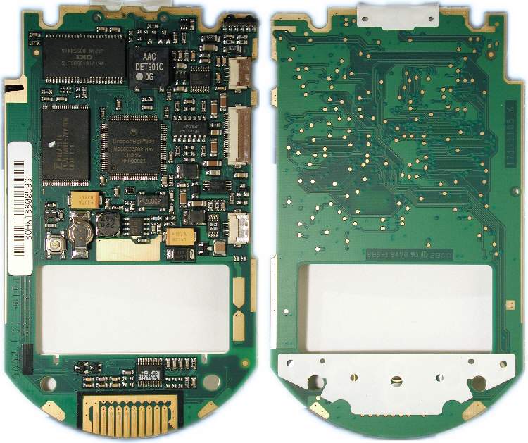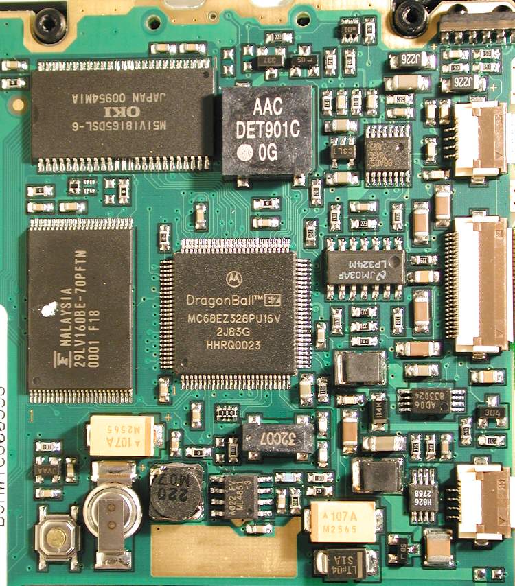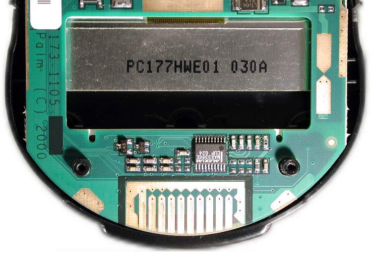 Except the serial driver, the image above shows indeed the complete electronic that is necessary to build a full working m100. The cases of the CPU, the RAM and the ROM are still quite conservative types (in the PalmV the much smaller BGA cases were partly used), but alot of the conventional parts are coming in smaller cases. Especially the coils for the switched power supply and the backlight hight voltage generation are much smaller. Broken coil edges which could be found quite often in the PalmIII are most likely history. The memory backup system, which is most likely no capacitor but a tiny Lithium Ion battery (I'm still not 100% sure about that), shrank also. But more about that in the power supply section. To answer the question right away, yes, the m100 could be upgraded to 8MB of RAM. In fact the m105 is nothing else than an upgraded m100. The problem for most users is most likely to find the right chip and an SMT equipment ... let alone the skills to desolder the chip without ruining the PCB. Better get an m105 right away! . |