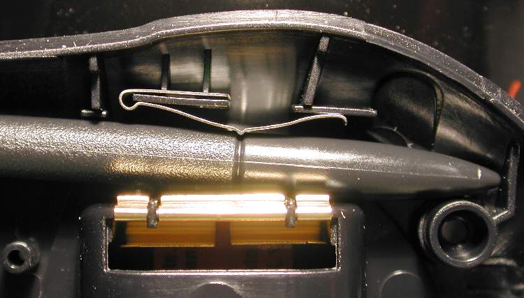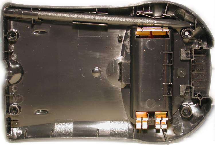 The construction is much more 'stiff'. The light battery contacts used in the Palm III were replaced by much more solid, goldplated v-spring contacts. I personally found the spiral contact for the positive pole of the battery in the Palm III never a particulary lucky solution. The flat contacts in the m100 are giving a much better contact and a firm hold. The contacts are now completely preassembled in the case and they make contact with the main PCB when the m100 is closed. BTW, the m100 is held closed with 4 Torx screws, so you better get a new tool if you want to have an own look inside your m100. . Nearly noble is the solution how the stylus is locked in its place. Ironically the cheapest Palm so far comes with the best solution. For once, the stylus has a better seperated space in the case. In the Palm III series, it could happen that the stylus scratched along the plastic flat cable coming from the LCD if that wasn't bend 100% right at assembly time. So the flat cable could be worn out. That problem is solved with the m100. Even better is the little metal spring that holds the stylus in place. Again on the Palm III series, the plastic 'naps' holding the stylus in place could wear out, or were too tight when the unit was new. The metal spring in the m100 gives a very smooth, definite feeling when arresting the stylus and holds it securely in place. Then again, taking the stylus out is as smooth as pushing it in. It sounds like no big deal, but high volume, low cost units like the m100 are optimized for each single cent and an additional metal part is definitely a cost factor. See the image below. . |