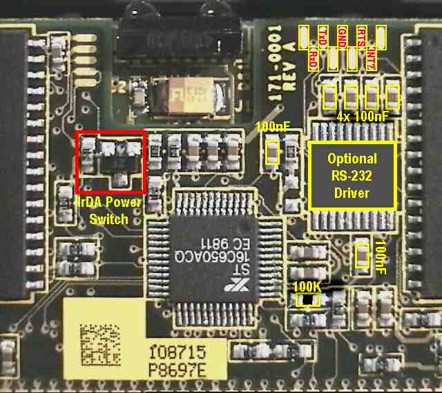 Interesting is, that 3Com left space for another wired RS-232 on the u/g board. There is the complete layout for an RS-232 level converter (MAX3232 , LTC1385 or SIPEX385A), routed already to the UART and a strange 9-pin pad arrangement, probably for another wierd 3Com connector :). Unfortunately 3Com tied the IrDA-tranceiver select and the RS232-driver select together, so they can't be selected independently - although there is a free option output on the UART ... grrrr! I assume *either* the RS-232 *or* the IrDA could be assembled - unless you modify the board, which you have to do anyway. . See the image below, all yellow bordered parts are for the optional RS-232 port. TAKE CARE: You have to seperate the RS-232 driver ENABLE (pin 20) from OP1 (pin 34) of the UART. But leave the connection between OP1 and the IrDA power switch intact! Then you can connect ENABLE with OP2 (pin 31) which is not connected so far (hopefully). That way, the IrDA port is selected with OP1 (default) and the additional driver with OP2 and the receive lines of the RS-232 driver and the IrDA tranceiver don't interfer. I know, I know - you need alot of additional software to drive these mods. But hey, someone might be crazy enough ... :) . Meanwhile I know also what IrDA-tranceiver is used. It's a Telefunken (Themic) part, the TFDU4100. I checked the datasheet, and very interesting, 3Com implemented it (what else) very conservative! The send LED can be driven with a pulsed current of 300mA, 3Com uses 150mA. The receiver has a 'sensitivity' pin, 3Com set it to LOW sensitivity! Using the part optimal, it has a range of 3 meter - I will try that out and post a modification here if it's true. The pity is, that *both* units have to be modified, for the long-range IrDA transmission. . UPDATE 11/06/98: Well, I tried the high sensitivity modification - it's no good!! True, the range is basically increased, but the receiver becomes so sensitive, that it catches really every single photon :) ... so you get too much noise. Save the time, the mod is useless! . |