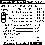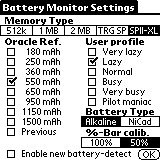 . Battery Monitor (BM) gives you quite an exact power consumption profile of your Pilot. BM monitors the total ON-time, how long the backlight was in use and how long the serial port was active. If you're a user of Eco Hack, BM will also tell you, how much percent you saved by using Eco Hack. But that's not all: From the collected data, BM calculates the used energy and tells you, how much percent you spend on each of the functions. Since BM also detects automatically when you changed batteries, it stores the date and a complete previous consumption profile. From the total time the batteries are in use, BM also calculates, how much of your batteries are drained while your Pilot is 'sleeping'. . !!! Please make sure, to take a look at the readme17.txt included in bmon_v17.zip !!! . . Download Battery Monitor v1.7 (23kB) (3 week uncrippled trialversion). . . Battery Monitor is an $8 shareware, please register.